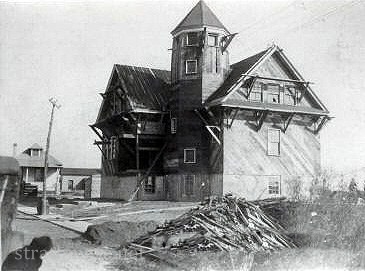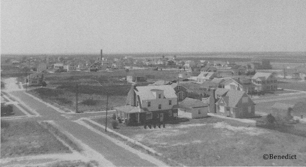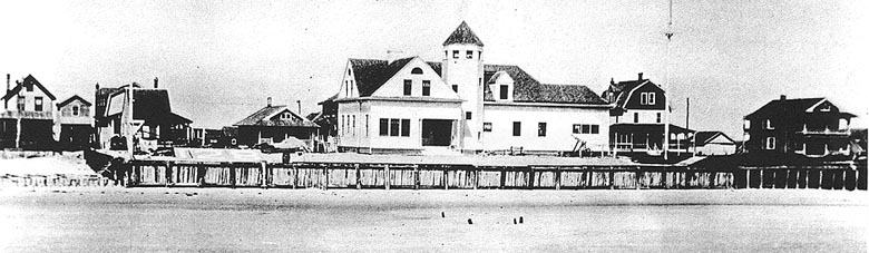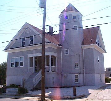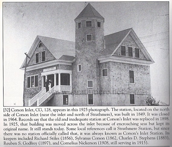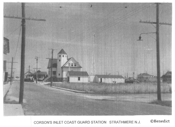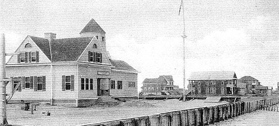 ![]() Above on the left is an old image from the Coast Guard of Corson's Inlet Life Saving Station, after it was built in 1872 on the Ocean City side of Corson's Inlet. The style of the building was known as 'Red House'. The second photo shows the 58th Street building after it was enlarged in 1899 to the 'Jersey Pattern' style of building. The station stood beachfront on 58th street on the Ocean City side of the inlet. In February of 1924, a storm caused massive damage to the bulkhead in front of the station. In May of that year, the US Coast Guard sent a representative to hold a town meeting about closing the station. The local Ocean City residents and representatives greatly opposed the closing of the station and emphasized it's importance. But by July the government had announced that it would close the 58th street station and relocate it to the south side of Corson's Inlet, in Strathmere. They pointed out that moving to the bay would enable them to build a new launchway building equipped with the new high speed boats. The main body of the station was dismantled, moved, and rebuilt in Strathmere in 1924-25. Below is a nice wide beachfront shot of the station when it was in in Ocean City ![]()
