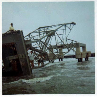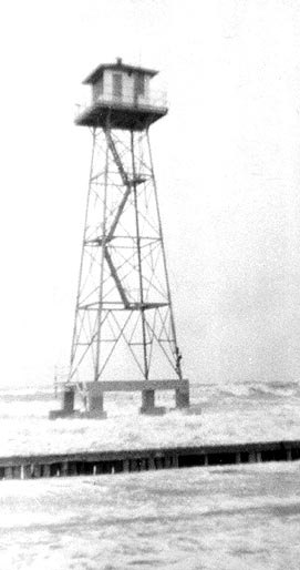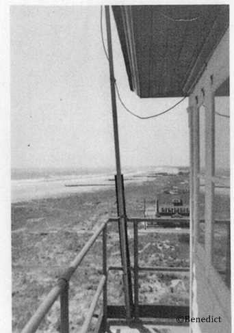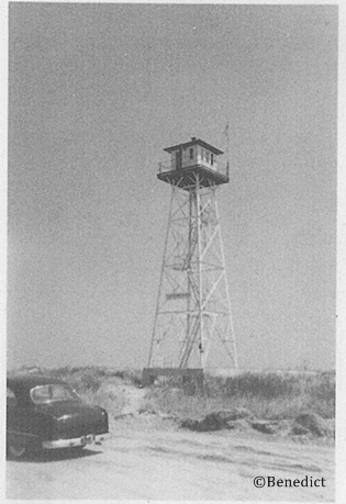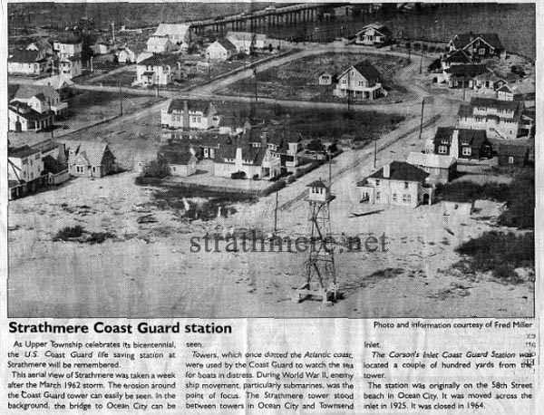![]() In the 1940's, a lookout tower was set up out on the beachfront side of the point. During WWII, the building on the south side of the post office was used as a sick bay for the Coast Guard. They also had dogs that they kept in back of the Coast Guard station during the war. There was always one dog and two men that patroled the beach 24 hours a day. Before and after the war, one man would go to the beach whenever it was foggy or snowing, as they could not always see from the tower. Their patrol area was north to Corson's Inlet and south to about 25th street in Sea Isle City. ![]() *Next is a newspaper article that features a 1962 image of the point, looking towards the bridge. The image was taken right after the storm of 1962. The small story mentions Upper Township's Bicentennial having a special rememberance of the old Coast Guard Tower. The tower was used by the Coast Guard to watch for boats in distress. It ceased being used in 1964, and was removed in 1967. (click image for larger view of story) *Finally, the tower in 1967, and when it fell over that same year.