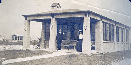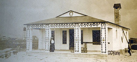 From 1915, Mrs. McCullough & Mr. Speakman stand in front of the concrete house that used to stand on the end of Sumner. The house was one of several built by Gilbert Smith.The house behind it to the left is on Tecumseh, and it was another of his houses. This house was torn down for new construction in 2005. Below is another Gilbert Smith concrete house, this one used to stand near the end of Sherman and it later collapsed on the beach. Mrs. McCullough is on the porch and the very old water tower can be seen just to the left of the house, in the background.