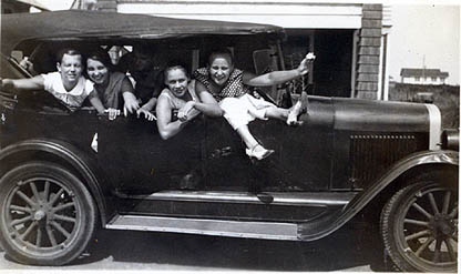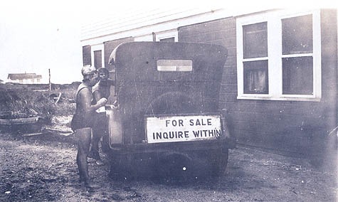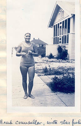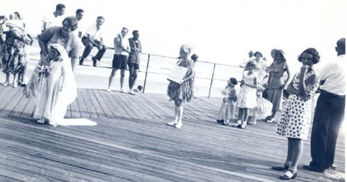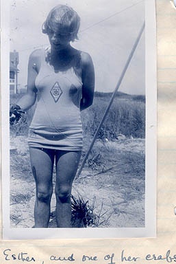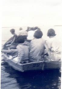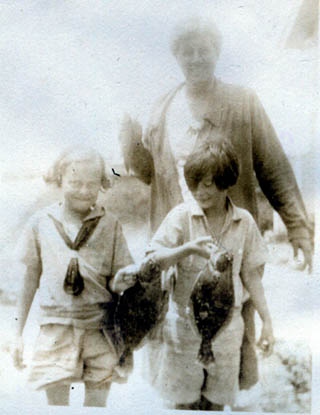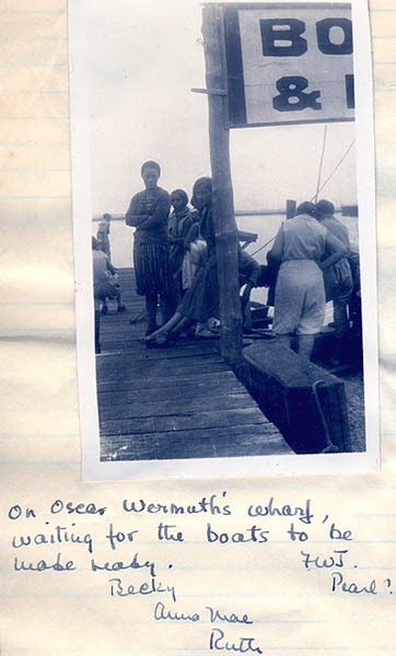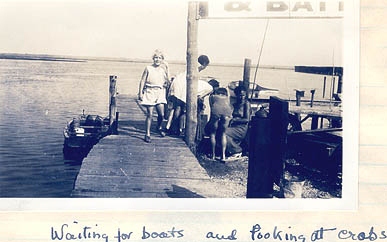 The girls also spent alot of time fishing and crabbing. They went to Oscar Wermuth's docks to be towed out into the bay by Oscar to fish or crab. They nicknamed two of the boats 'Pea Green' and 'Columbus' Several times they went out rowing on their own, but the tide pulled them out to the bridge one time and some fellows from the Coast Guard had to pull their little boat back in. That Summer they caught 56 fish, a few eels (one was given to Mrs. Wermuth) and 575 crabs. Below are some photos of the docks at Wermuth's and the girls out in the boats.