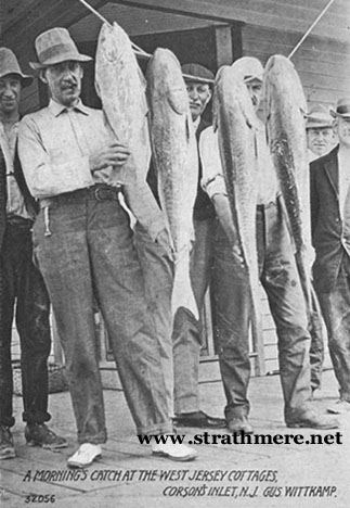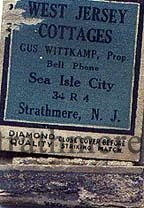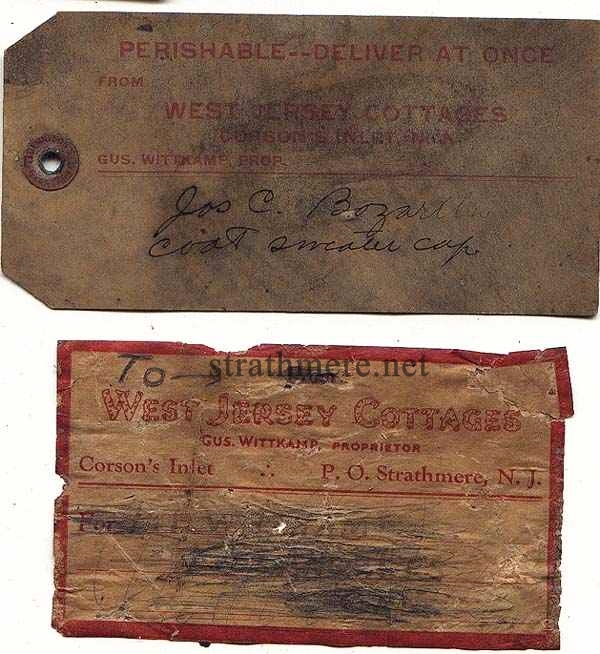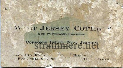 William B. Moore front and center and Bess Moore at right 2nd row. ![]() This photo was taken in front of the West Jersey Cottage and dated 1917. Link Roden, Joe Bozarth, Stead Applegate, Hartie Phillips and Paul O'Neill were fishermen who were friends of Herbert K. Savage and they are each mentioned in some of his Field & Stream fishing and hunting stories. ![]() This photo is on the bay beach near the railroad bridge - Herbert K. Savage, Bertha Wittkamp and Harold. ![]() A view of the West Jersey Cottage from the bay. ![]() Fishermen on the porch of the West Jersey Cottage with proprietor Gus Wittkamp second from left. ![]() The Wittkamp's dog with a friend on the front steps of the Annex, late Teens. ![]() ![]() A side view of the West Jersey Cottage when it was on Winthrop, with our house next to it. Postmarked 1921. The front mentions the Famous Corson's Inlet Fishing Grounds. ![]() A view of Winthrop and the West Jersey Railroad train station. The station use to be where the car bridge is now. The hotel is gone but the other 4 houses still stand on Winthrop. ![]() 'Whitkamp's Wharf, Corson's Inlet NJ'. Post marked 1908. This is a view of the bay beach in front of where the West Jersey Cottage and the Railroad station wer located. That's the railway bridge in the background. (The name should actually be spelled 'Wittkamp') A post card of fisherman at the West Jersey Cottage, sent to us by Glen Kranefeld ![]() 'A Day's catch by New York Fishermen at the West Jersey Cottage' - postcard from 1909 ![]() ![]() Carrie Wittkamp died in 1930, and Gus died in 1935. They left the Hotel to their children Bertha, Estelle & Harlan. Harlan took over as manager of the hotel until 1944. Above is an old brochure for the hotel from the late 1930's when it was managed by Harlan. In 1944 a terrible hurricane blew through the Jersey coast. The damage that was done to the hotel was more than what the Wittkamps could afford to repair. They sold what could be salvaged from the main hotel building, and it was moved down the road to the main intersection. That part of the hotel became a deli and convenience store run by Harlan and his wife Margaret. He also worked as a toll taker on the bridge and his wife was the postmaster for Strathmere for 25 years. The building has seen many transformations since then, from Ernie's Gas & Food to Harker's Diner, to a deli, to it's current use as an Italian Restaraunt. The annex of the West Jersey Cottages has remained intact and Bertha lived in the annex with her half-sister Estelle, who was a widow. The annex had been converted into 2 apartments. They lived on one floor, and continued to rent out the other floor. After Estelle died in 1969, Bertha moved into the boathouse behind the annex that had been turned into an efficiency cottage. Bertha was a Red Cross nurse. She
