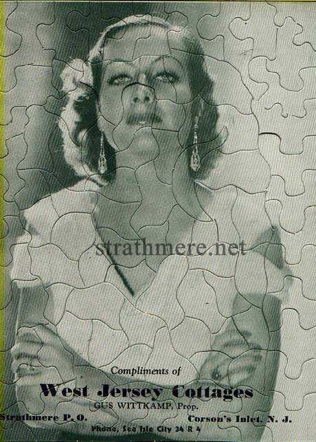 ![]() Above is an old business card. Most of the face of the card has been nibbled away by mice and by time. But part of the name and a little of the photo still show. ![]() Not actually a found item, this was a bought item. It is a give-away promotional puzzle for West Jersey Cottages, featuring the image of a young Joan Crawford.